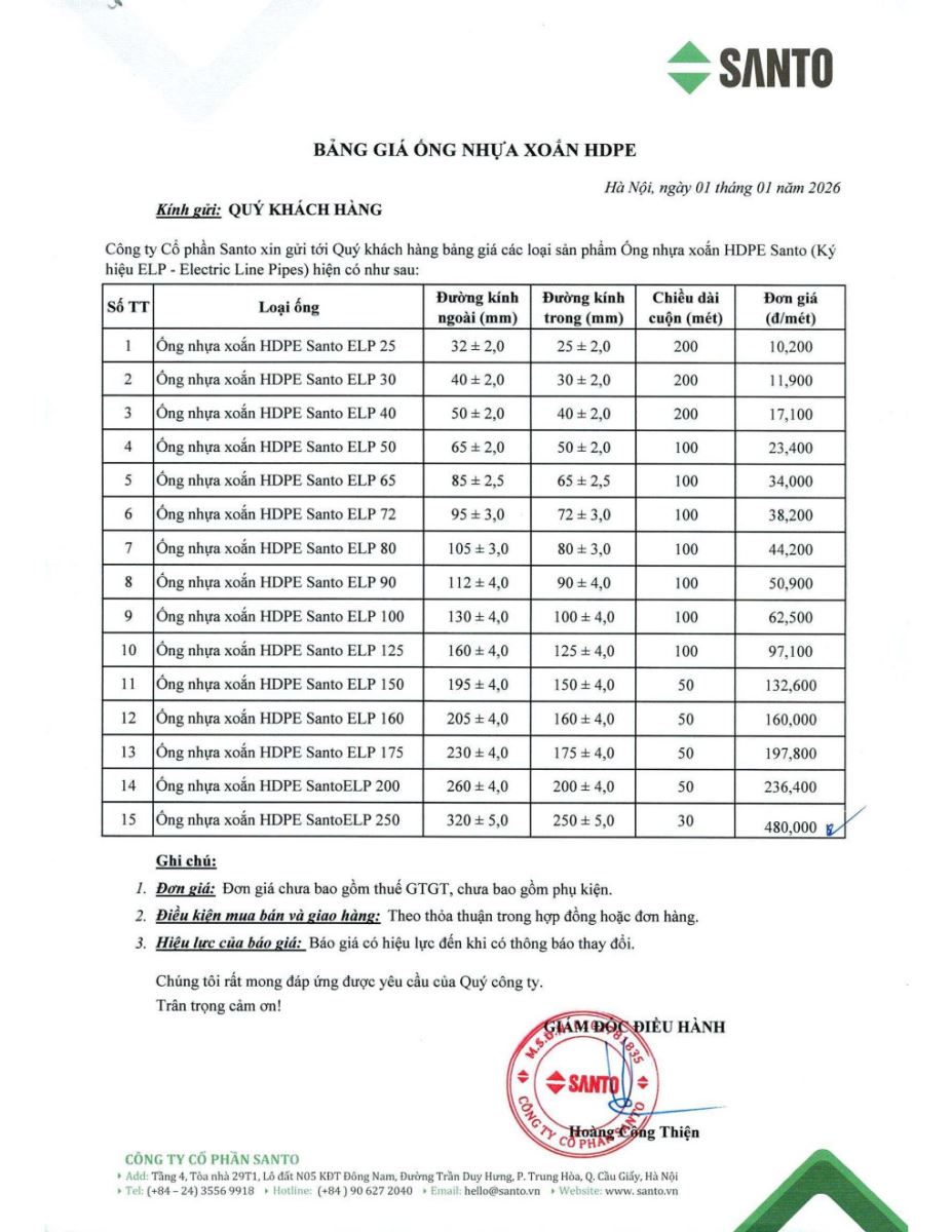 BẢNG GIÁ ỐNG NHỰA XOẮN HDPE Tin tức liên quan SANTO ỨNG DỤNG CÔNG NGHỆ IN LASER UV TRÊN TEM NHÃN & SẢN PHẨM 30/12/2025 SANTO THÔNG BÁO LỊCH NGHỈ TẾT DƯƠNG LỊCH 2026 26/12/2025 SANTO THÔNG BÁO LỊCH NGHỈ LỄ QUỐC KHÁNH 2/9 28/08/2025 SANTO THÔNG BÁO LỊCH NGHỈ MÁT 2025 10/06/2025 THÔNG BÁO LỊCH NGHỈ LỄ 30.04 & 01.05 22/04/2025