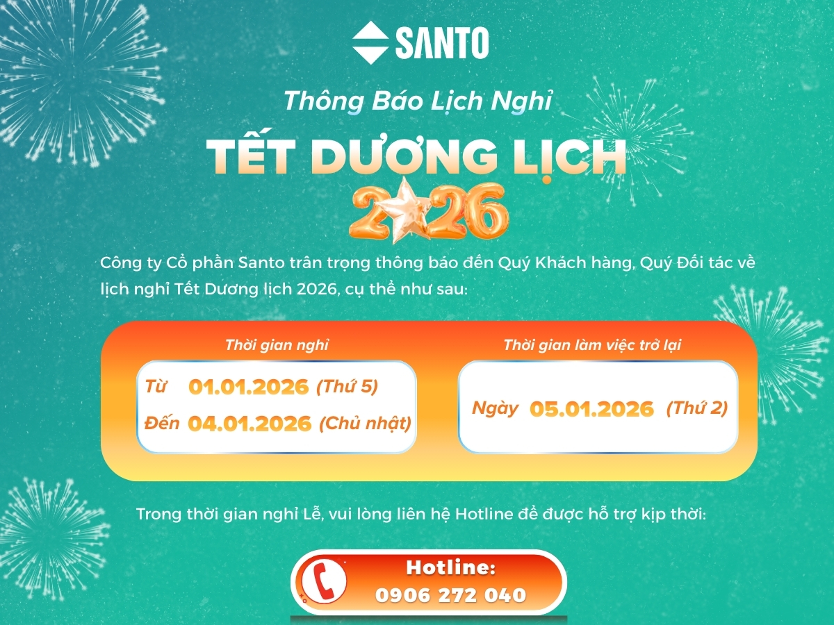 SANTO THÔNG BÁO LỊCH NGHỈ TẾT DƯƠNG LỊCH 2026 Kính chúc Quý khách hàng, Quý đối tác có những ngày nghỉ Lễ nhiều niềm vui bên người thân và gia đình! Tin tức liên quan SANTO THÔNG BÁO LỊCH NGHỈ LỄ QUỐC KHÁNH 2/9 28/08/2025 SANTO THÔNG BÁO LỊCH NGHỈ MÁT 2025 10/06/2025 THÔNG BÁO LỊCH NGHỈ LỄ 30.04 & 01.05 22/04/2025 THÔNG BÁO NGHỈ LỄ GIỔ TỔ HÙNG VƯƠNG (MÙNG 10 THÁNG 3 ÂM LỊCH) 03/04/2025 THÔNG BÁO LỊCH NGHỈ TẾT NGUYÊN ĐÁN 2025 22/01/2025
