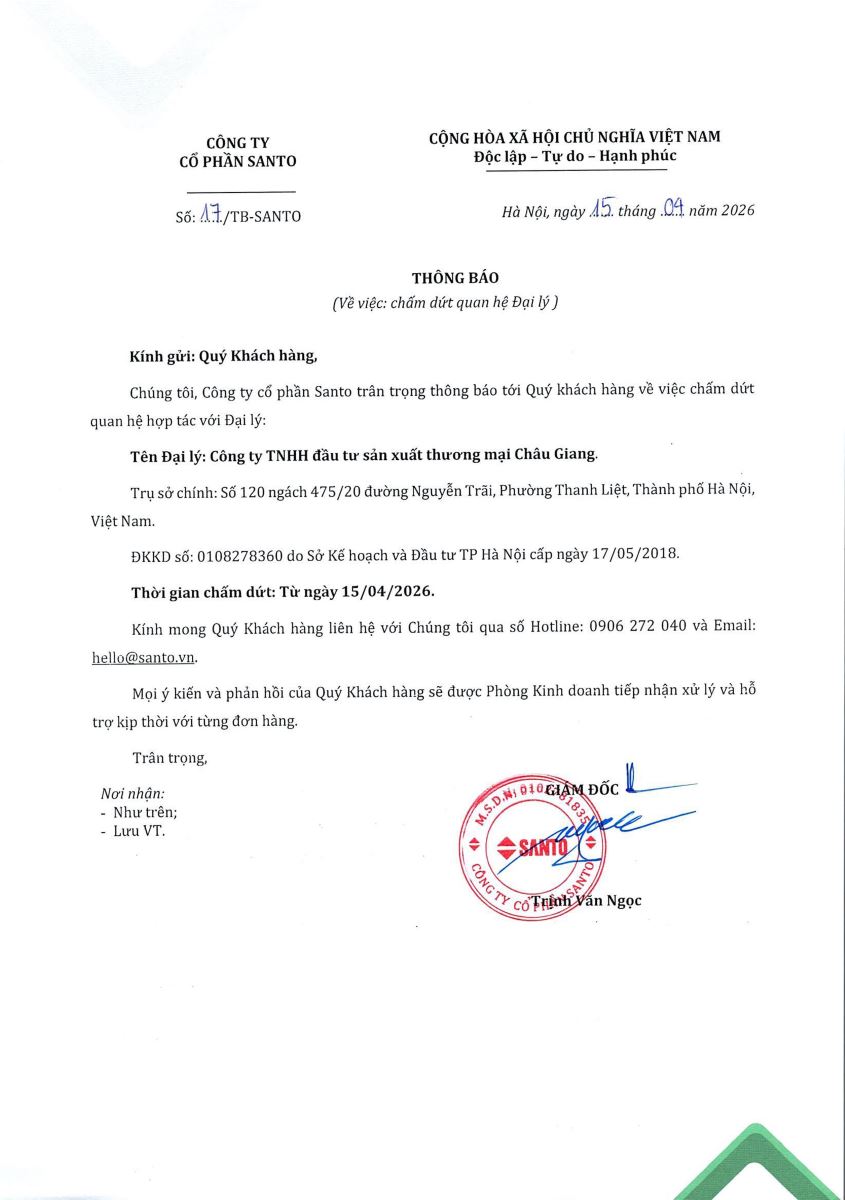 THÔNG BÁO DỪNG HỢP TÁC ĐẠI LÝ VỚI CÔNG TY TNHH ĐẦU TƯ SẢN XUẤT THƯƠNG MẠI CHÂU GIANG Tin tức liên quan THÔNG BÁO LỊCH NGHỈ TẾT NGUYÊN ĐÁN BÍNH NGỌ 2026 09/02/2026 BẢNG GIÁ ỐNG NHỰA XOẮN HDPE 31/12/2025 SANTO ỨNG DỤNG CÔNG NGHỆ IN LASER UV TRÊN TEM NHÃN & SẢN PHẨM 30/12/2025 SANTO THÔNG BÁO LỊCH NGHỈ TẾT DƯƠNG LỊCH 2026 26/12/2025 SANTO THÔNG BÁO LỊCH NGHỈ LỄ QUỐC KHÁNH 2/9 28/08/2025