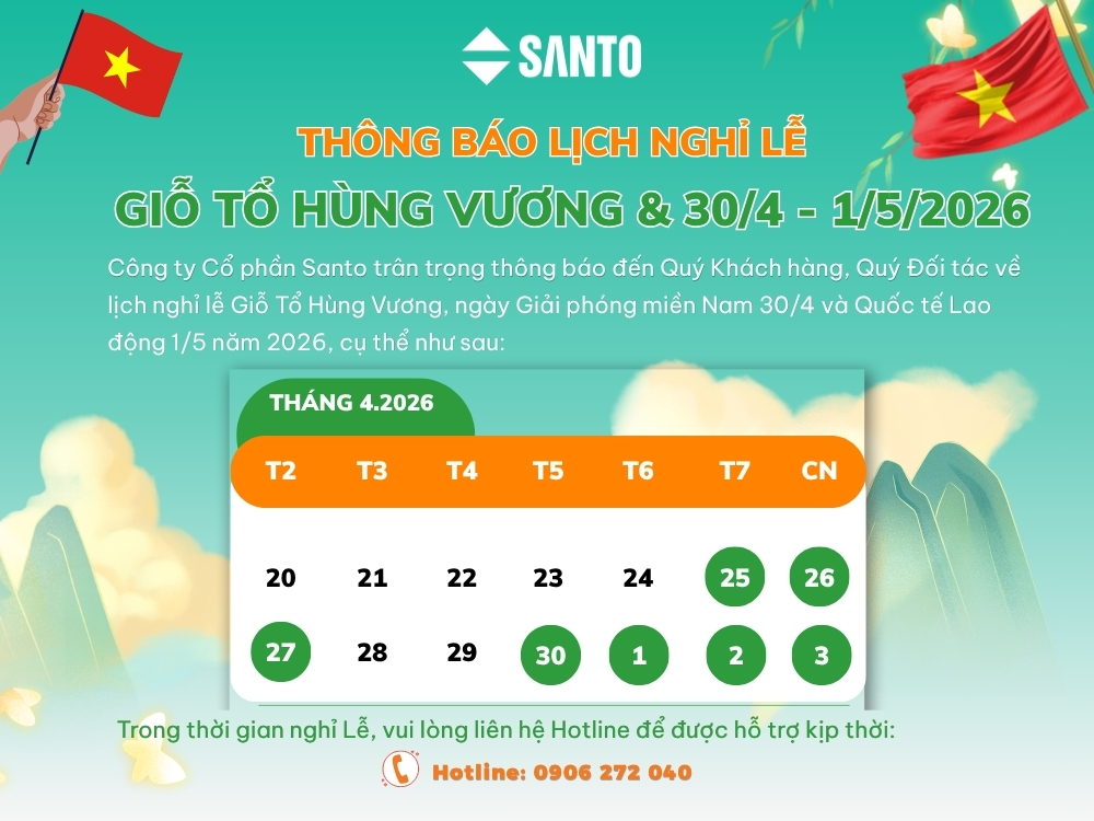 THÔNG BÁO LỊCH NGHỈ LỄ GIỖ TỔ HÙNG VƯƠNG VÀ LỄ 30/04 - 01/05/2026 Công ty Cổ phần Santo trân trọng thông báo: Tin tức liên quan THÔNG BÁO DỪNG HỢP TÁC ĐẠI LÝ VỚI CÔNG TY TNHH ĐẦU TƯ SẢN XUẤT... 14/04/2026 THÔNG BÁO LỊCH NGHỈ TẾT NGUYÊN ĐÁN BÍNH NGỌ 2026 09/02/2026 BẢNG GIÁ ỐNG NHỰA XOẮN HDPE 31/12/2025 SANTO ỨNG DỤNG CÔNG NGHỆ IN LASER UV TRÊN TEM NHÃN & SẢN PHẨM 30/12/2025 SANTO THÔNG BÁO LỊCH NGHỈ TẾT DƯƠNG LỊCH 2026 26/12/2025