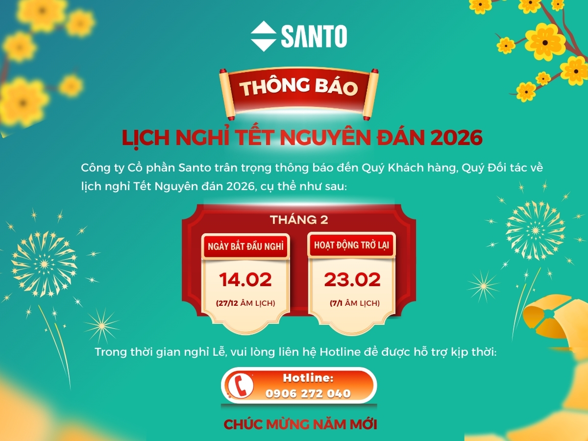 THÔNG BÁO LỊCH NGHỈ TẾT NGUYÊN ĐÁN BÍNH NGỌ 2026 Tin tức liên quan BẢNG GIÁ ỐNG NHỰA XOẮN HDPE 31/12/2025 SANTO ỨNG DỤNG CÔNG NGHỆ IN LASER UV TRÊN TEM NHÃN & SẢN PHẨM 30/12/2025 SANTO THÔNG BÁO LỊCH NGHỈ TẾT DƯƠNG LỊCH 2026 26/12/2025 SANTO THÔNG BÁO LỊCH NGHỈ LỄ QUỐC KHÁNH 2/9 28/08/2025 SANTO THÔNG BÁO LỊCH NGHỈ MÁT 2025 10/06/2025